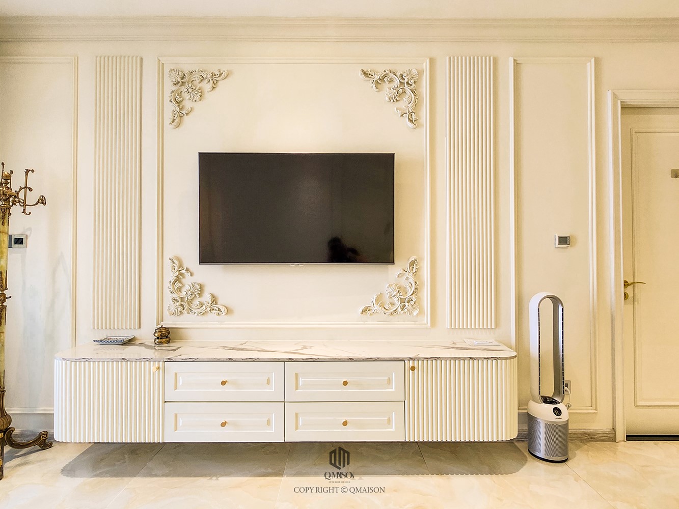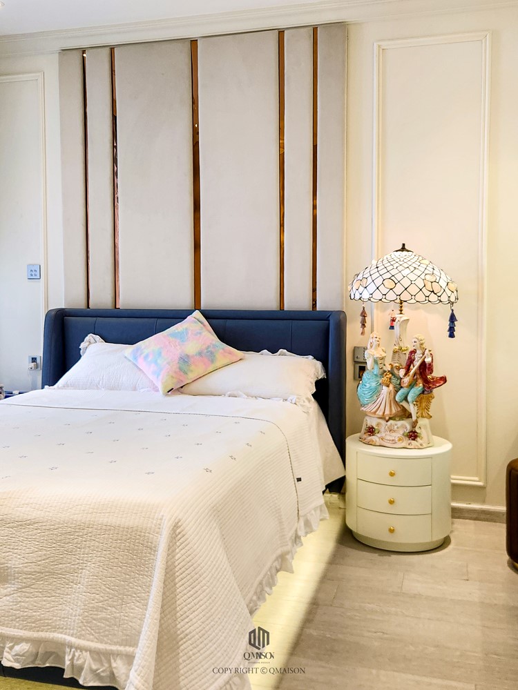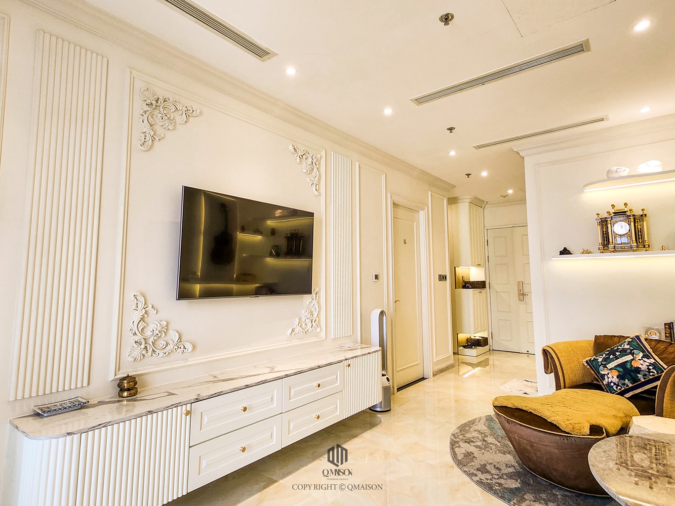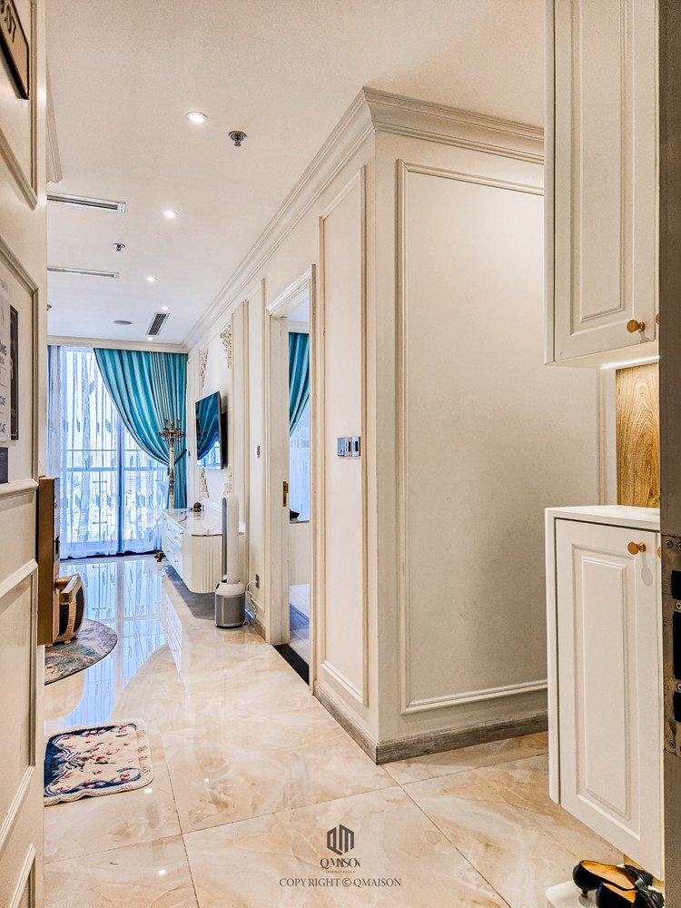 Căn hộ Vinhomes Golden River do Q Maison thực hiện cho thấy sự chuyển dịch rõ ràng từ phối cảnh sang không gian sống thực tế, nơi các giá trị thiết kế được kiểm chứng bằng độ chính xác và chất lượng hoàn thiện. Ngôn ngữ Neo Classic được thể hiện qua hệ phào chỉ ốp tinh gọn, tỷ lệ đối xứng được cân chỉnh và tiết chế để phù hợp với căn hộ 1 phòng ngủ mà vẫn giữ được chiều sâu thẩm mỹ.