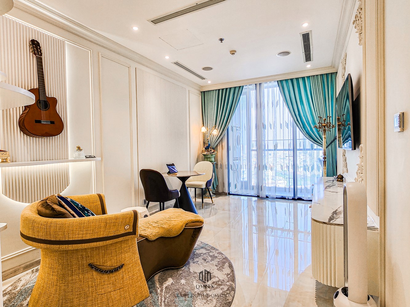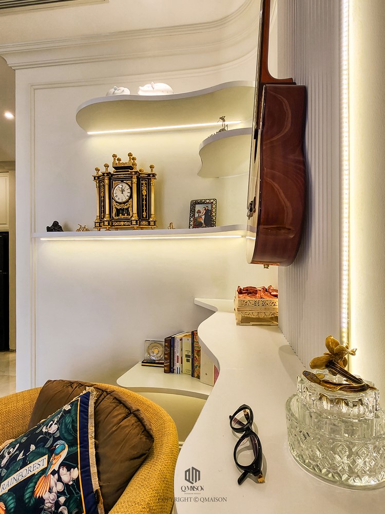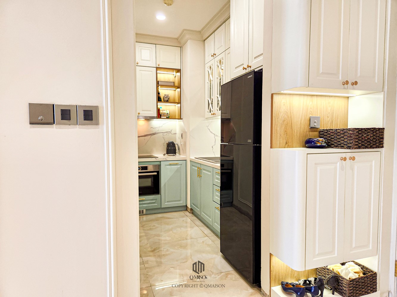 Căn hộ Vinhomes Golden River do Q Maison thực hiện cho thấy sự chuyển dịch rõ ràng từ phối cảnh sang không gian sống thực tế, nơi các giá trị thiết kế được kiểm chứng bằng độ chính xác và chất lượng hoàn thiện. Ngôn ngữ Neo Classic được thể hiện qua hệ phào chỉ ốp tinh gọn, tỷ lệ đối xứng được cân chỉnh và tiết chế để phù hợp với căn hộ 1 phòng ngủ mà vẫn giữ được chiều sâu thẩm mỹ.