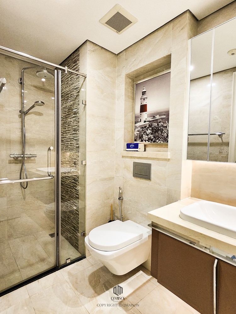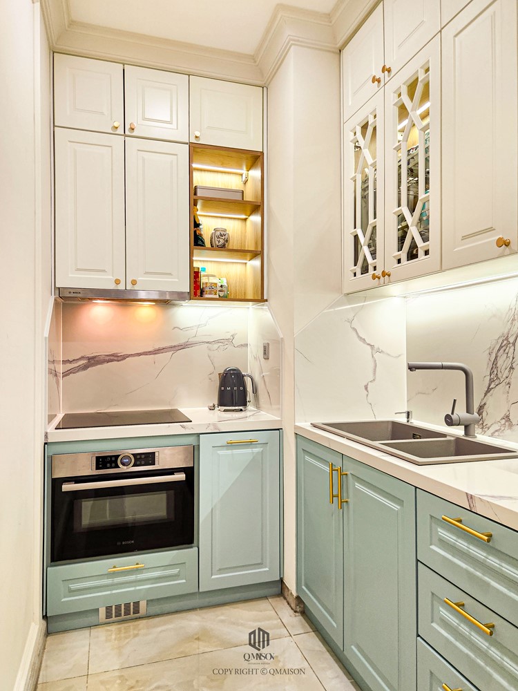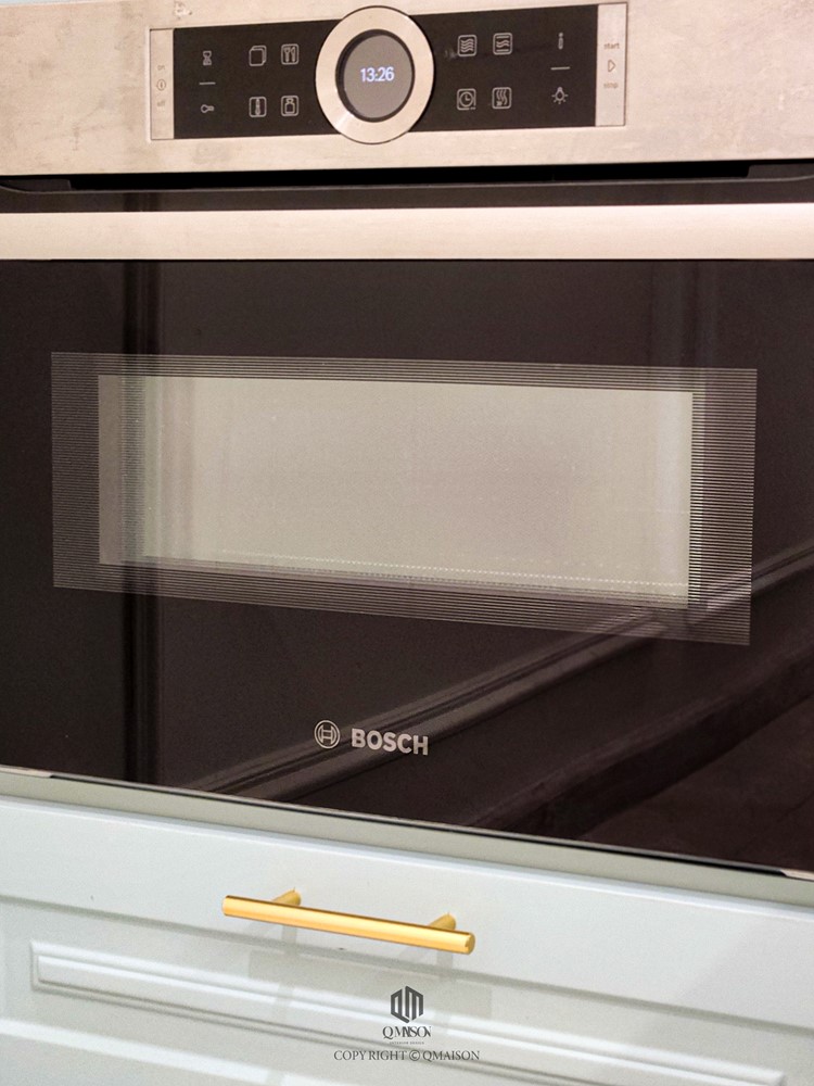 Điểm đáng chú ý hơn ở cách Q Maison phối hợp các vật liệu khác nhau: Các bề mặt đá bếp, hệ vách ốp vân cá sấu làm điểm hút ánh nhìn phòng ngủ master kết hợp với các chi tiết nhũ kim như nẹp kết thúc và tay nắm tủ tạo điểm nhấn tinh tế cho tổng thể. Hệ tủ âm được thi công chuẩn xác, cánh tủ pano được chau chuốt và phủ sơn 2K, chuyển động đóng mở êm, khe hở đều, đảm bảo trải nghiệm sử dụng ổn định về lâu dài. Ánh sáng cũng hắt được bố trí nhằm tôn hình khối kiến trúc thay vì tạo hiệu ứng phô trương. Bảng màu trung tính khi đưa vào không gian thực giữ được sự trầm ổn, giúp căn hộ vừa sang trọng vừa phù hợp với nhịp sống hiện đại. Với Q Maison, giá trị của dự án nằm ngay chính những chi tiết này, âm thầm nhưng bền vững theo thời gian.