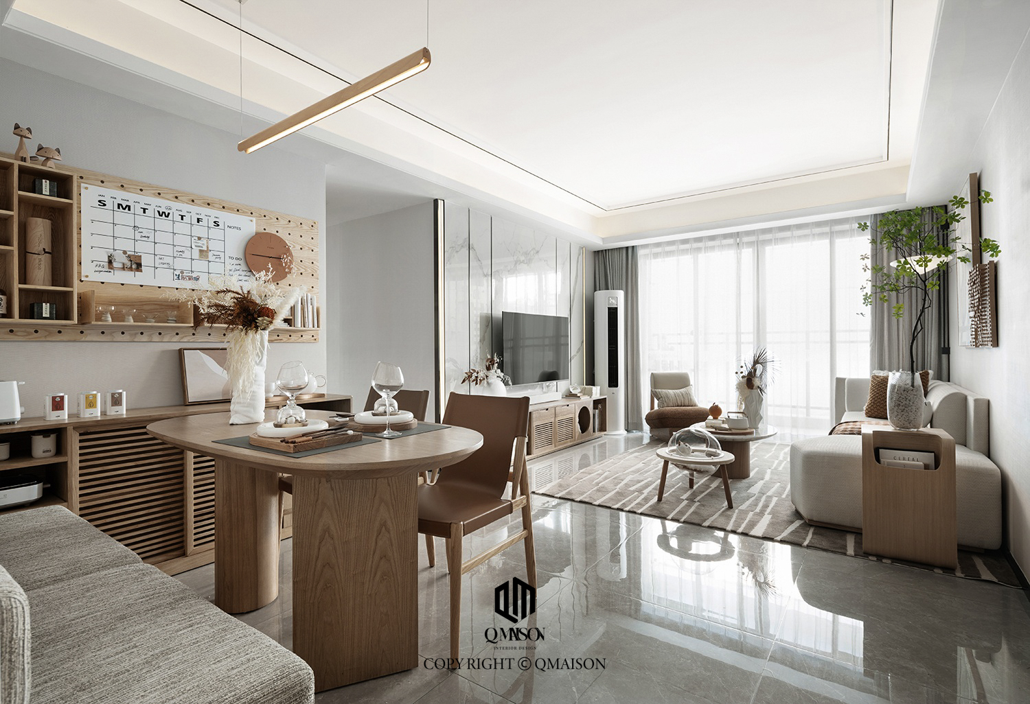 QMaison tự hào là đơn vị đã góp phần hiện thực hóa giấc mơ đó khi thực hiện thi công nội thất cho một căn hộ mẫu mực tại đây. Căn hộ mang phong cách Japandi được thiết kế với bố cục mở,đường nét hay chi tiết nội thất bo cong mềm mại. bảng màu trung tính như tone gỗ sáng được phối với vật liệu tự nhiên tạo điểm nhấn như vải linen của rèm hay draft giường, hoa cỏ khô của đồ trang trí. Ánh sáng được xử lý nhẹ nhàng, giúp từng góc nhỏ đều toát lên cảm giác an yên và gần gũi.