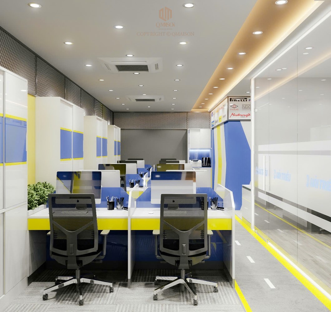 Trong dự án thiết kế cho văn phòng Michelin Authorized tại TP.HCM, Q Maison hướng đến một không gian làm việc hiện đại, chuyên nghiệp nhưng vẫn gắn liền với bản sắc thương hiệu. Trên diện tích 220m², bố cục văn phòng được tổ chức mở, đảm bảo sự liền mạch trong lưu thông và tăng khả năng tương tác giữa các bộ phận. Ba gam màu chủ đạo trắng, xanh dương và vàng vốn là brand palette đặc trưng của Michelin, được phối hợp một cách cân bằng: trắng tạo nền sáng thoáng, xanh dương mang lại cảm giác tin cậy, còn vàng nhấn mạnh sự năng động và truyền cảm hứng. Sự kết hợp này không chỉ làm nổi bật tinh thần thương hiệu, mà còn tạo cảm xúc tích cực cho nhân sự trong suốt ngày làm việc.