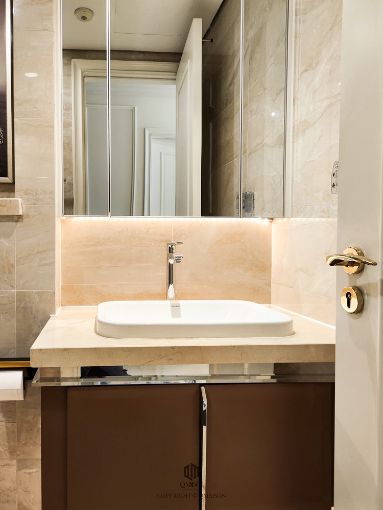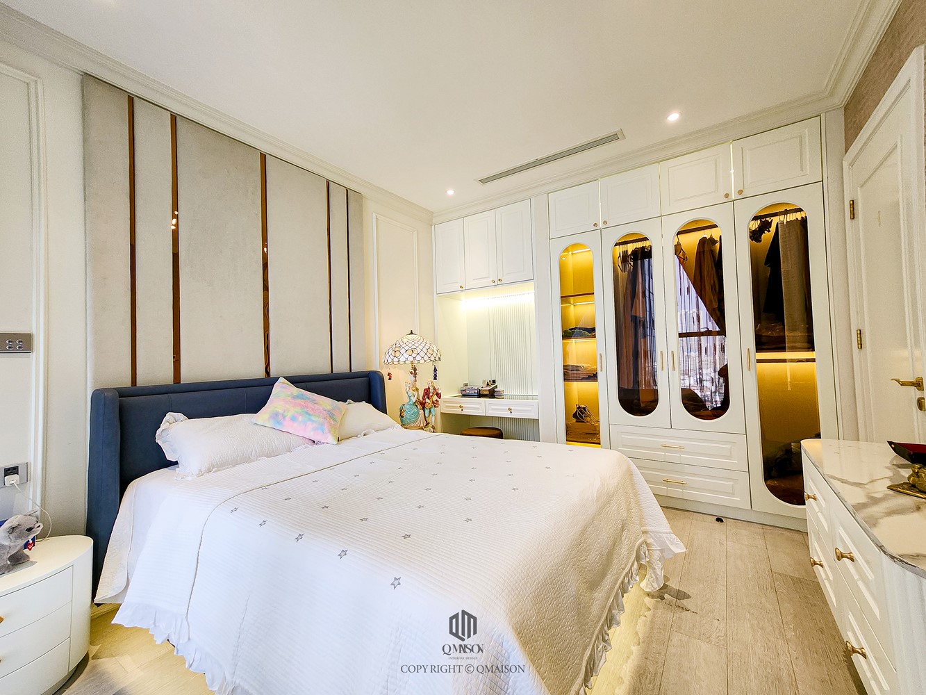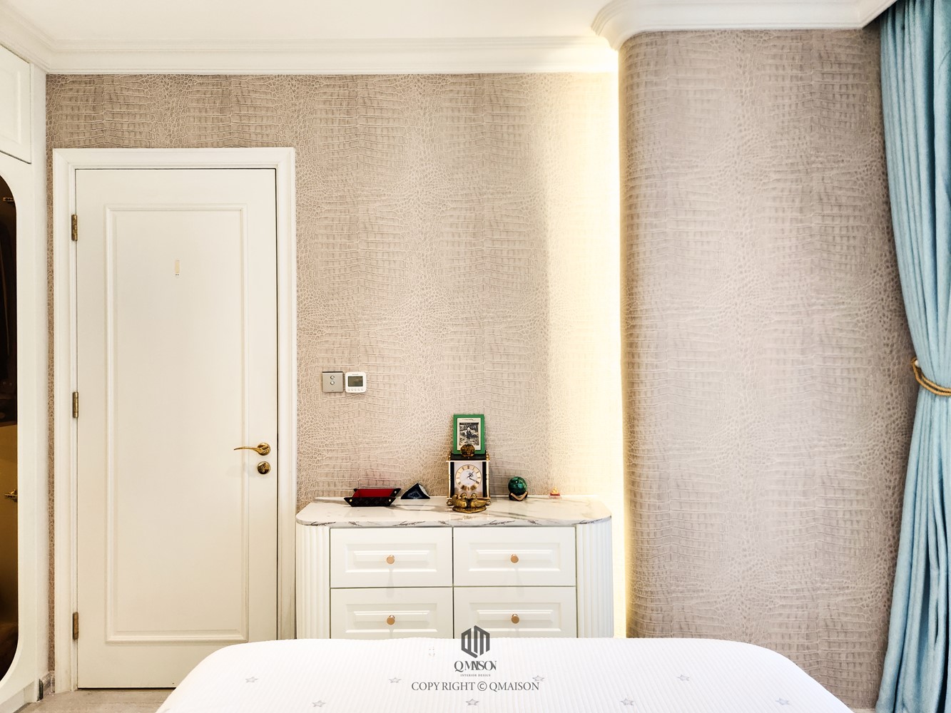 Điểm đáng chú ý hơn ở cách Q Maison phối hợp các vật liệu khác nhau: Các bề mặt đá bếp, hệ vách ốp vân cá sấu làm điểm hút ánh nhìn phòng ngủ master kết hợp với các chi tiết nhũ kim như nẹp kết thúc và tay nắm tủ tạo điểm nhấn tinh tế cho tổng thể. Hệ tủ âm được thi công chuẩn xác, cánh tủ pano được chau chuốt và phủ sơn 2K, chuyển động đóng mở êm, khe hở đều, đảm bảo trải nghiệm sử dụng ổn định về lâu dài. Ánh sáng cũng hắt được bố trí nhằm tôn hình khối kiến trúc thay vì tạo hiệu ứng phô trương. Bảng màu trung tính khi đưa vào không gian thực giữ được sự trầm ổn, giúp căn hộ vừa sang trọng vừa phù hợp với nhịp sống hiện đại. Với Q Maison, giá trị của dự án nằm ngay chính những chi tiết này, âm thầm nhưng bền vững theo thời gian.