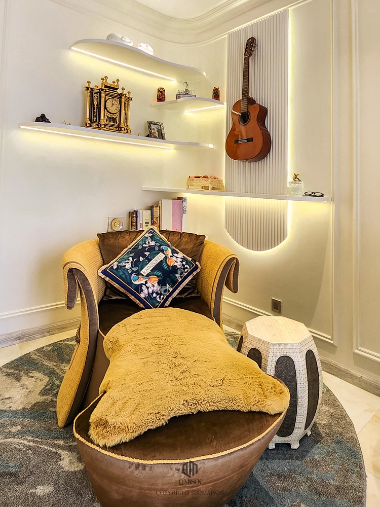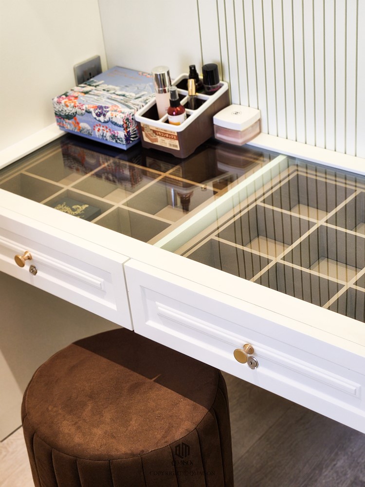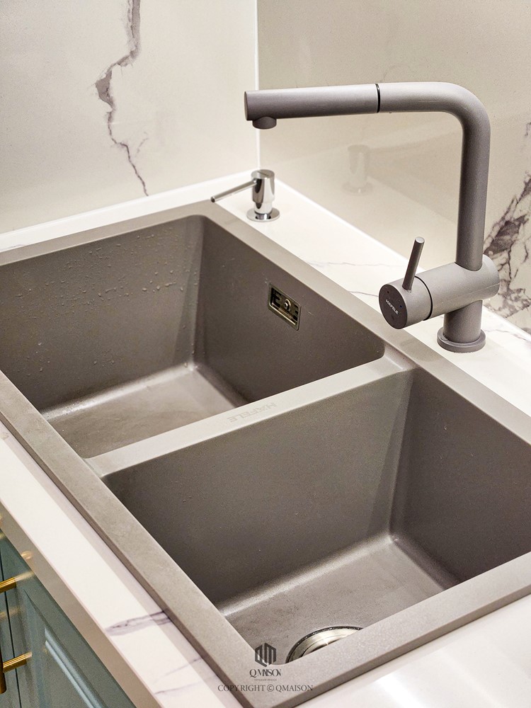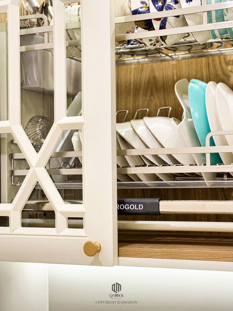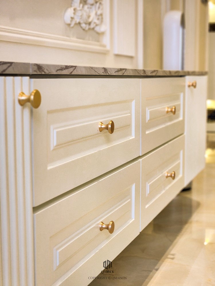 Điểm đáng chú ý hơn ở cách Q Maison phối hợp các vật liệu khác nhau: Các bề mặt đá bếp, hệ vách ốp vân cá sấu làm điểm hút ánh nhìn phòng ngủ master kết hợp với các chi tiết nhũ kim như nẹp kết thúc và tay nắm tủ tạo điểm nhấn tinh tế cho tổng thể. Hệ tủ âm được thi công chuẩn xác, cánh tủ pano được chau chuốt và phủ sơn 2K, chuyển động đóng mở êm, khe hở đều, đảm bảo trải nghiệm sử dụng ổn định về lâu dài. Ánh sáng cũng hắt được bố trí nhằm tôn hình khối kiến trúc thay vì tạo hiệu ứng phô trương. Bảng màu trung tính khi đưa vào không gian thực giữ được sự trầm ổn, giúp căn hộ vừa sang trọng vừa phù hợp với nhịp sống hiện đại. Với Q Maison, giá trị của dự án nằm ngay chính những chi tiết này, âm thầm nhưng bền vững theo thời gian.