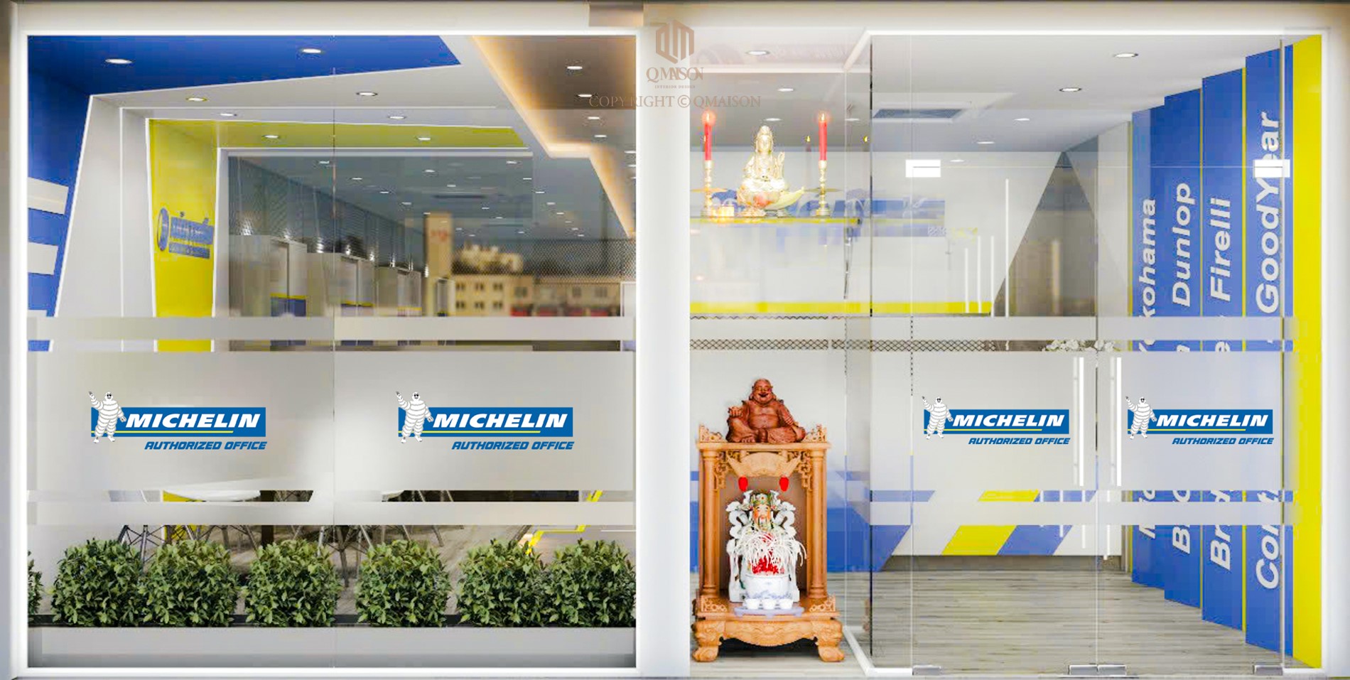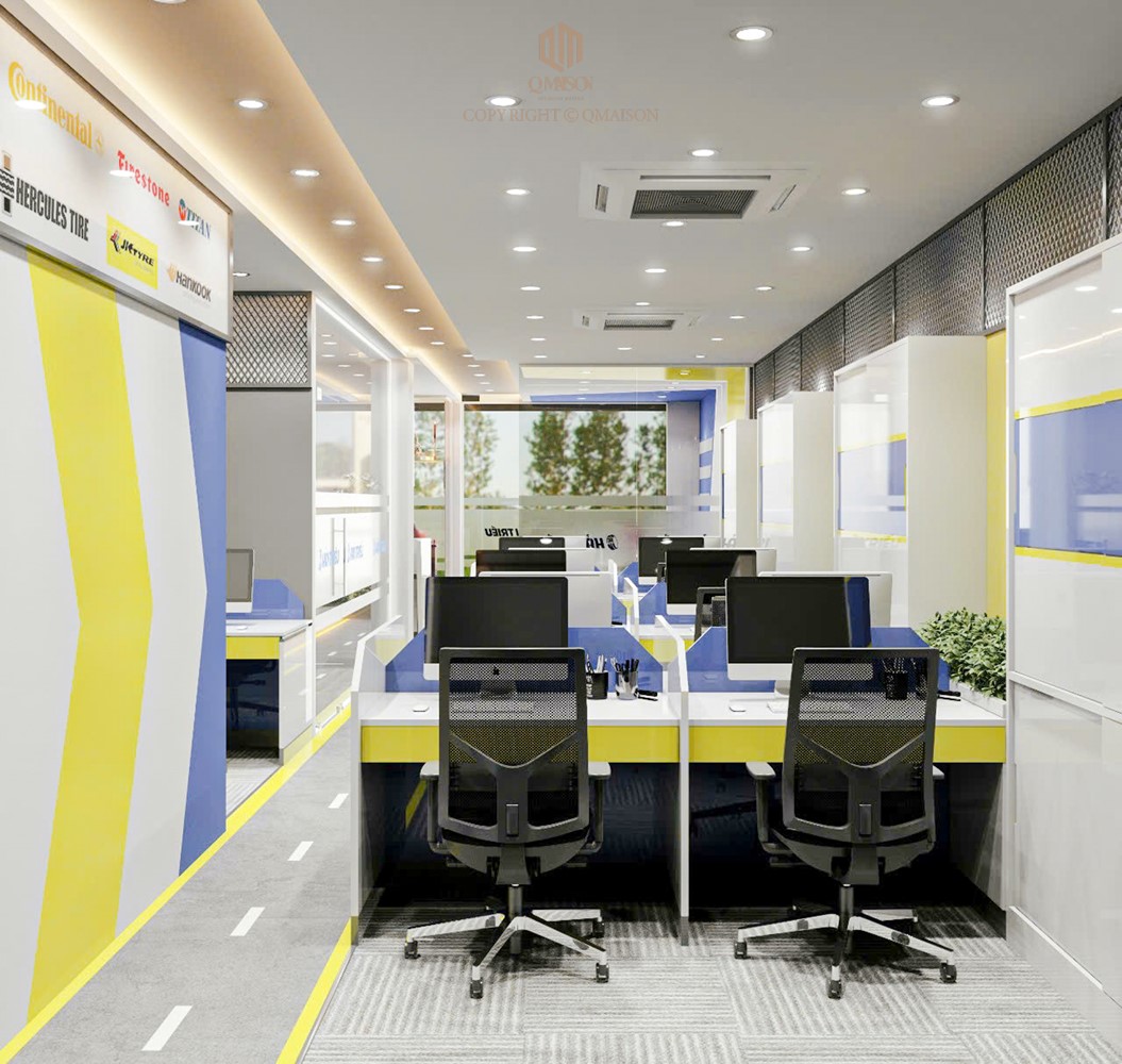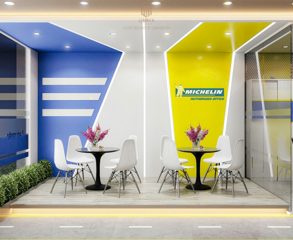 Trong dự án thiết kế cho văn phòng Michelin Authorized tại TP.HCM, Q Maison hướng đến một không gian làm việc hiện đại, chuyên nghiệp nhưng vẫn gắn liền với bản sắc thương hiệu. Trên diện tích 220m², bố cục văn phòng được tổ chức mở, đảm bảo sự liền mạch trong lưu thông và tăng khả năng tương tác giữa các bộ phận. Ba gam màu chủ đạo trắng, xanh dương và vàng vốn là brand palette đặc trưng của Michelin, được phối hợp một cách cân bằng: trắng tạo nền sáng thoáng, xanh dương mang lại cảm giác tin cậy, còn vàng nhấn mạnh sự năng động và truyền cảm hứng. Sự kết hợp này không chỉ làm nổi bật tinh thần thương hiệu, mà còn tạo cảm xúc tích cực cho nhân sự trong suốt ngày làm việc.